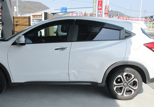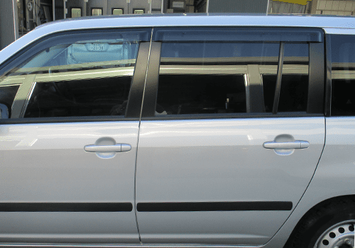 トヨタ サクシードの修理事例です。当該車は左側面を自動車と衝突し、フロントドアからリアバンパーまで損傷しました。