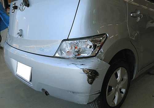 トヨタ bBの修理事例です。当該車は右後方を自動車と衝突し、リアバンパーから右リアフェンダーにかけて損傷しました。