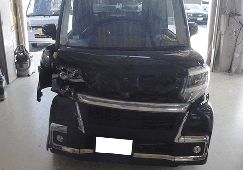 軽ワゴン車であるダイハツ タントの修理事例です。当該車は衝突事故により車体前部を著しく損傷しており、お持ち込みの段階でフレームの歪みも確認できました。