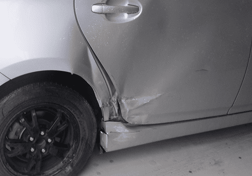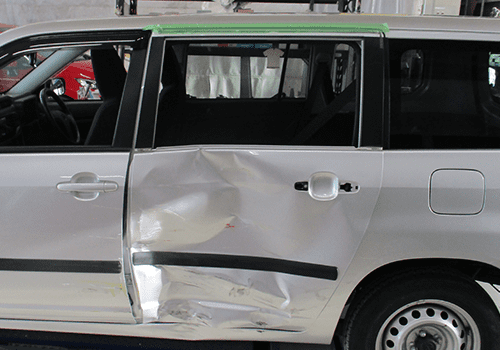 トヨタ サクシードの修理事例です。当該車は左側面を自動車と衝突し、フロントドアからリアバンパーまで損傷しました。