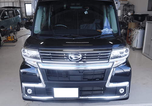 軽ワゴン車であるダイハツ タントの修理事例です。当該車は衝突事故により車体前部を著しく損傷しており、お持ち込みの段階でフレームの歪みも確認できました。